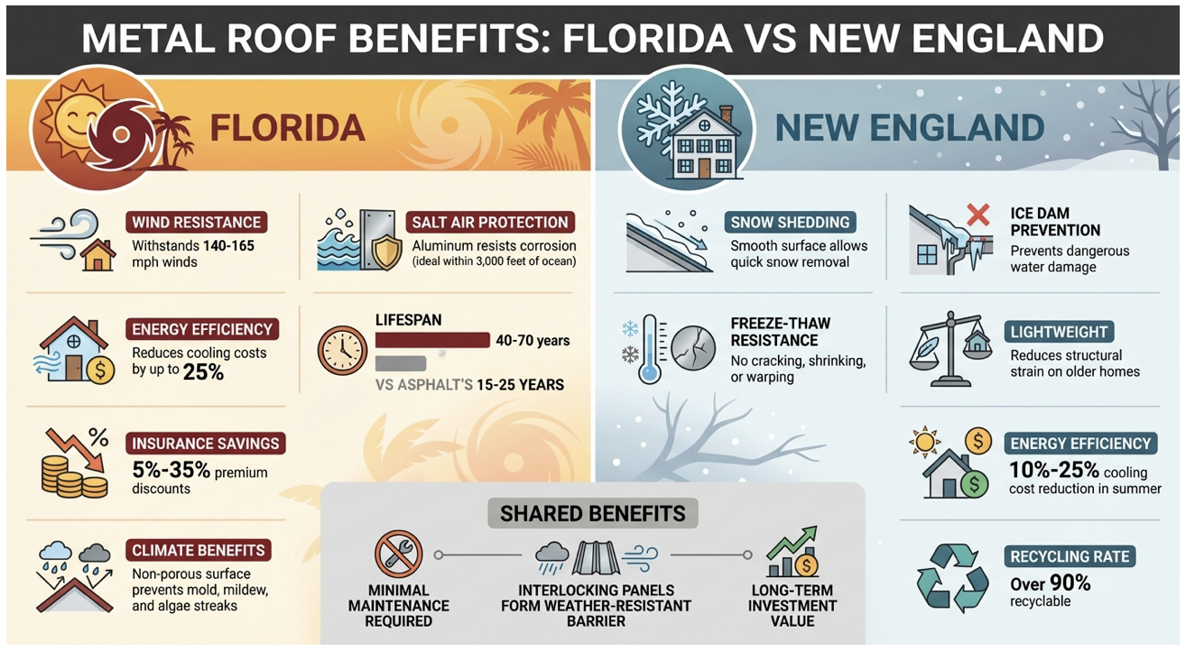 Homes in Florida and New England face very different weather challenges, and metal roofs are uniquely suited to tackle both. Whether it's Florida's intense heat and hurricane-force winds or New England's heavy snow and freeze-thaw cycles, metal roofing provides solutions tailored to these demanding climates.